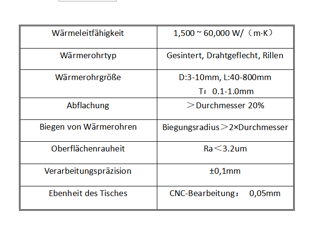 1、Auswahl der Heatpipe:Heatpipes mit unterschiedlichen Kapillarstrukturen haben unterschiedliche Wärmeübertragungsleistungen. In der Praxis müssen zusätzlich Biege-, Flachpress- und andere Formgebungsprozesse durchgeführt werden, um den verschiedenen Wärmequellen gerecht zu werden. Zudem beeinflussen der Durchmesser, die Länge und die Montageausrichtung der Heatpipe ihre Wärmeübertragungsleistung.